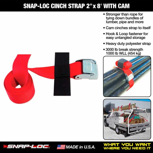 Snap-Loc 2 x 96″ Cinch Strap with Cam is stronger and safer than rope/bungees and quickly bundles/ties down pipe, lumber, ladders, nets, tarps and more to pickups, trucks, trailers, racks, walls, floors, ceilings and more! THE PROBLEM: Cheap hook straps come loose, break often causing valuable items to dangerously fall, tangle into a frustrating ball of spaghetti and waste your time and money. THE SOLUTION: The Snap-Loc E-Track Single System securely anchors all sized cargo items where you need it, uses long lasting 2″ wide professional movers straps and stows away neatly in small spaces. You’re going to love it! Our E-Track System also coordinates with the Snap-Loc Dolly System to easily move more in less time with high capacity smooth rolling casters, E-Track Strap attachment and Push Cart Panel Cart conversion. EASIER: Bundles/ties down pipe, lumber, ladders, nets, tarps and more to pickups, trucks, trailers, racks, walls, floors, ceilings and more. Cam buckle cinches items firmly in place. FASTER: Quick release cam buckle connects and disconnects with spring loaded lever. Saves time by not tangling like bungees and rope. SAFER: Much stronger than bungee cords and rope. Cinch straps lock in place, they don’t fall off like hook straps and don’t dangerously spring back or break like bungee cords. USA HEAVY DUTY BUILT TO LAST: USA made long lasting 2″ wide polyester strap webbing with steel zinc plated hardware to resist contaminants/weather. Hook/loop fastener neatly stows strap away. SPECIFICATIONS: 3,000 lb break 1,000 lb WLL. Professional movers strap accessory. See other Snap-Loc items for more straps and accessories.