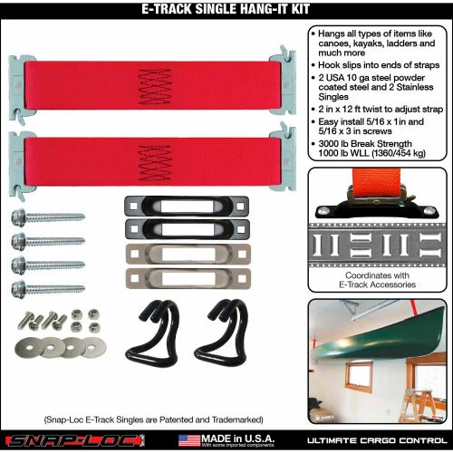 The Snap-Loc E-Track Single Hang-It Kit System is the easiest, fastest and safest way to hang items on ceilings and tie-down items on pickups, trucks, trailers, racks, walls, floors and more! THE PROBLEM: Cheap hook straps come loose, break often causing valuable items to dangerously fall, tangle into a frustrating ball of spaghetti and waste your time and money. THE SOLUTION: The Snap-Loc E-Track Single System securely anchors all sized cargo items where you need it, uses long lasting 2 inch wide professional movers straps and stows away neatly in small spaces. You’re going to love it! Our E-Track System also coordinates with the Snap-Loc Dolly System to easily move more in less time with high capacity smooth rolling casters, E-Track Strap attachment and Push Cart Panel Cart conversion. EASIER: Stows/hangs canoes, kayaks, ladders and more on ceilings/walls and ties-down items on pickups, trucks, trailers, racks, floors and more. Very easy install and long lasting solution. FASTER: Put as many E-Track Singles where needed making storage and loading/unloading much faster. Hooks quickly transform straps into multiuse hook straps. Simply twists to adjust strap length. SAFER: E-Track Singles lock E-Straps in place, they don’t break like cheaper built straps and ropes do. Coordinates with Snap-Loc E-Track Dolly System and fits industry standard E-Track accessories. USA HEAVY DUTY BUILT TO LAST: USA thick 10 gauge steel powder coated and USA 12 gauge stainless steel both resist contaminants/weather. USA made long lasting 2 x12″ polyester strap webbing. SPECIFICATIONS: 3,000 lb break 1,000 lb WLL. 5-3/4 x 1 x 1/2″ holes 5″-o.c. Zinc fasteners 5/16 x 1-5/8″ Allen, 5/16 x 3″ Lag. See other Snap-Loc items for more straps and accessories.