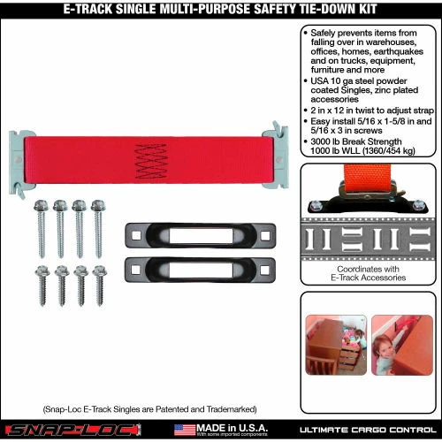 The Snap-Loc E-Track Single Safety Kit System is the easiest, fastest and safest way to tie-down/prevent items from falling over in warehouses, offices, homes, earthquakes and is used on furniture, equipment, pickups, trucks, trailers, racks, walls, floors, ceilings and more! THE PROBLEM: Cheap hook straps come loose, break often causing valuable items to dangerously fall, tangle into a frustrating ball of spaghetti and waste your time and money. THE SOLUTION: The Snap-Loc E-Track Single System securely anchors all sized cargo items where you need it, uses long lasting 2″ wide professional movers straps and stows away neatly in small spaces. You’re going to love it! Our E-Track System also coordinates with the Snap-Loc Dolly System to easily move more in less time with high capacity smooth rolling casters, E-Track Strap attachment and Push Cart Panel Cart conversion. VERSITILE SOLUTIONS: Tie-down/prevent items from falling in warehouses, offices, homes, earthquakes. Use on furniture, equipment, pickups, trucks, trailers, racks, walls, floors, ceilings and more. VERSITILE SOLUTIONS: Tie-down/prevent items from falling in warehouses, offices, homes, earthquakes. Use on furniture, equipment, pickups, trucks, trailers, racks, walls, floors, ceilings and more. EASIER: Very easy install and long lasting solution. Simply twists to adjust strap length. Coordinates with Snap-Loc E-Track Dolly System and fits industry standard E-Track accessories. USA HEAVY DUTY BUILT TO LAST: USA thick 10 gauge steel powder coated to resist contaminants/weather. USA made long lasting 2 x12″ polyester strap webbing with steel zinc plated hardware. SPECIFICATIONS: 3,000 lb break 1,000 lb WLL. 5-3/4 x 1 x 1/2″ holes 5″-o.c. Zinc plated Lag screws 5/16 x 1-5/8″ and 5/16 x 3″. See other Snap-Loc items for more straps and accessories.